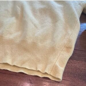 A timeless addition to your wardrobe: a vintage Barrie for The Scotch House 100% cashmere sweater. This luxurious piece features a cozy turtleneck, long sleeves with rolled cuffs, and a classic fit. The soft, pale yellow hue adds a touch of sophistication to any outfit. There's a small blemish on the front that is subtle and doesn't detract from the item's classic look. Perfect for a chic weekend brunch, a cozy evening by the fireplace, or adding a touch of elegance to your everyday attire. Imperfection on front of shirt shown up close in the last 2 photos.