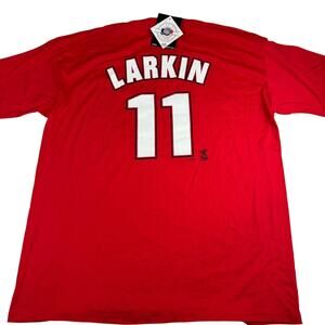 You are viewing a vintage Barry Larkin Cincinnati Reds T-shirt from the 00s. This shirt is new with tags and in excellent condition. A must-have for any Reds or baseball fan! Don't miss out on the chance to own a piece of baseball history! This shirt would look great at the game or wearing around town. Grab it now! Size 2XL