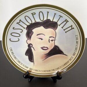Vintage Marketplace Barware Plate. Cosmopolitan Martini Recipe is printed around the lower edge of the plate. Diameter is 8.5in. In Very Good condition with no chips. There is a scratch on the paint area below the girl’s chin. Please zoom in on photos.
