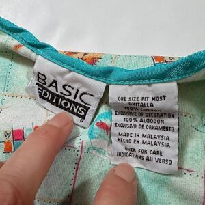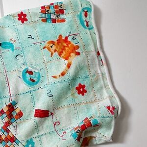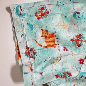 In good used condition. Adorable little night shirt with little kitties, birds and fish bowls! Light turquoise color. Has front chest pocket and the little bow on neckline. One of the sleeves did come unhemmed as shown. Tagged one size!