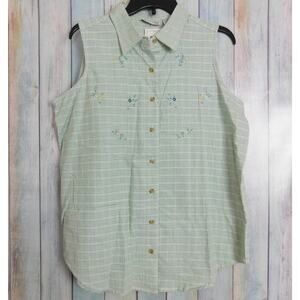 Vintage Basic Editions Woman Shirt Large Green White Plaid Embroidered Flowers