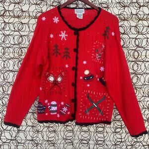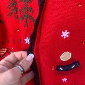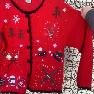 Vintage Basic Editions red knit ugly Christmas cardigan sweater. Featuring winter motif of snow shoes, ice skates, skis, hats, mittens and trees. Has faux clear hidden buttons for easier buttoning than faux bulky Corchet covered buttons