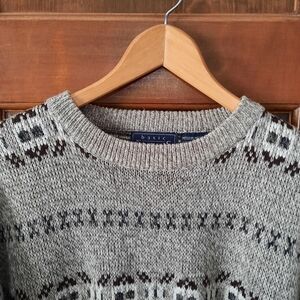 Vintage Basic Editions tan white fair isle Cosby Grandpa knit sweater size M. Pullover style crewneck sweater with marled tan and white knit, Nordic fair isle brown striped pattern, big roomy sleeves, and ribbed collar, cuffs, and waistband. In excellent condition! Lightweight warm material 100% acrylic. Unisex. Size medium.