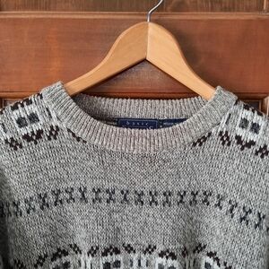 Vintage Basic Editions tan white fair isle Cosby Grandpa knit sweater size M. Pullover style crewneck sweater with marled tan and white knit, Nordic fair isle brown striped pattern, big roomy sleeves, and ribbed collar, cuffs, and waistband. In excellent condition! Lightweight warm material 100% acrylic. Unisex. Size medium.