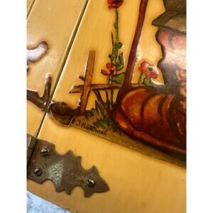 This is a beautiful vintage basket that would be a lovely addition to any home. The basket features a charming J. Hummel print on the cover, adding a touch of nostalgia and sweetness. The interior is lined with a soft green fabric, providing a gentle contrast to the exterior design. Measuring 11"x9"x7", it's the perfect size for storing small items or displaying decorative pieces.