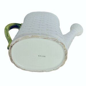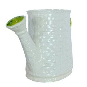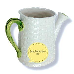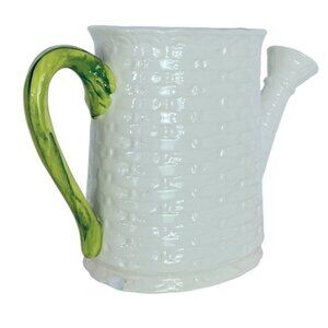 Vintage Cottagecore Ceramic Watering Can Basket Weave design Multipurpose Vessel Collectible Planter White Green