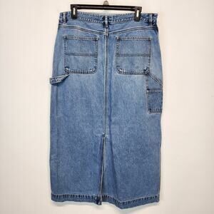 Vintage Bass Denim Maxi Carpenter Skirt Size 12 32" Medium Wash Back Slit Indie