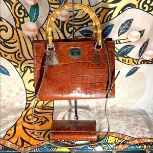 Vintage Bayou Collection Dooney & Bourke Alligator Embossed Leather Satchel. Features bamboo handle and detachable strap. Includes matching wallet. Top magnetic closure. Inside zipper pocket
