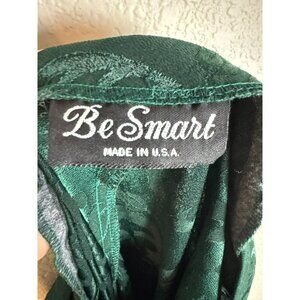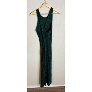 Vintage Be Smart Maxi Dress in size medium is a stunning dark green floral textured dress. Made of lightweight polyester, this sleeveless dress features a V-neckline and a pullover closure for easy wear with criss cross straps in back of dress. The dress has a long length and is adorned with floral jacquard accents, giving it a Y2K and 90s-inspired feel. Made in USA. Excellent condition, no flaws.