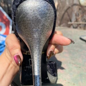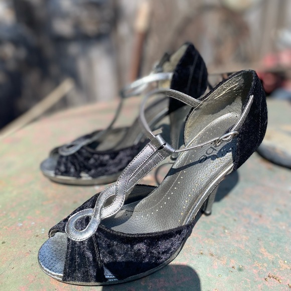 Chic black velvet heels with silver accents. Ideal for elegant outings.