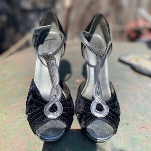 Vintage BeBe Retro Disco Black and Silver Velvet Heels Gatsby Regency Flapper