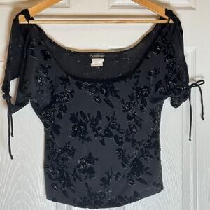 Vintage BeBe Women's Black Silver Floral off shoulder Crop Top Large Boho Goth