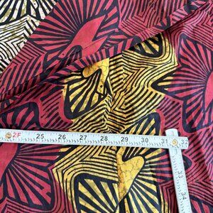 Features striking vertical batik-style floral stripes in burgundy red, yellow, and cream/black with abstract flower motif
