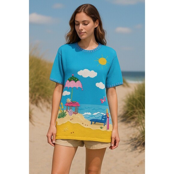 Vintage Beach Scene Knit Sweater Blue Summer Embroidered novelty Tunic Top Sz S