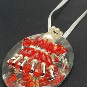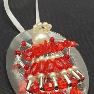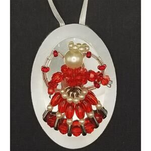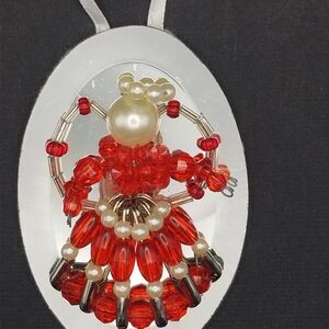 Vintage Beaded Angel Ornament Mirror 3" Red Pearl Handmade Safety Pins