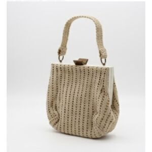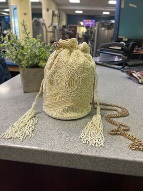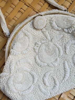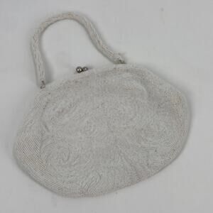 Vintage beaded bag meant to be worn on your belt. Snap closure is broken. Interior stained. One bead missing at the back. Beads are white, cream and a kind of metallic champagne. 6” wide x 3.5” high. Pretty little bag that just needs a little TLC!