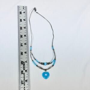 Vintage Beaded Black Blue Open Heart Pendant Necklace Jewelry Metal 7"