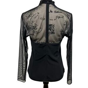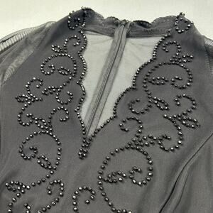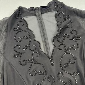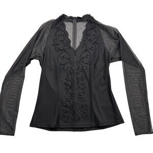 Gorgeous 1980s 1990s evening wear bouse. This is all black with black beaded embellishments along neckline and front in a swirl type pattern. This has black sheer mesh long sleeves and sheer low cut back. Deep V-neck neckline with a scallop hem cutout shape along neckline. Zipper in back for closure. 92% Nylon 8% spandex- stretch / stretchy. soft silky texture. Brand: J.R. Nites by Caliendo Made in USA