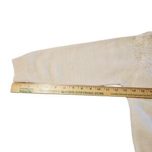 Vintage Primstyle hand-decorated cardigan sweater in a soft cream color. Size 38. EU Size 38 typically converts to a U.S. Women's Size 8 (Medium). See pictures for measurements. Features beaded floral accents and iridescent sequins across the front. Made in Hong Kong with 70% lambswool, 20% angora rabbit hair, 10% nylon, and fully lined in rayon.