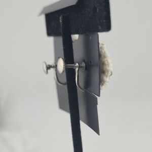 Charming vintage handmade beaded earrings featuring concentric circles of white and smoky gray seed beads. Each earring measures approximately 1 inch across and is backed with felt and finished with classic screw-back findings—perfect for non-pierced ears.