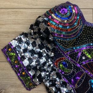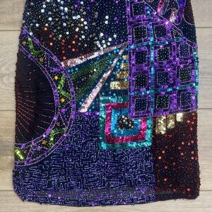Stunning vintage sequin and bead embellished cocktail dress. A perfect statement piece to sparkle at events and parties. The dazzling and unique pattern features checkered sequins and rainbow geometric designs. The shoulder pads give this runway ready sheath dress the classic power silhouette of the 80’s. Short sleeves and a v back with zip closure. Fully lined. No size on the tag, but it measures like a size 0 Extra Small XS. Some VERY minor loose threads and the liner has some splitting on the top interior at the back slit, not visible while wearing. No noticeable flaws and overall excellent vintage condition.