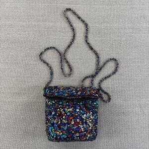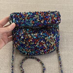 Super sweet little glam purse. Beaded with sequins in silver, gold, red, blue, teal and purple. So 90s.