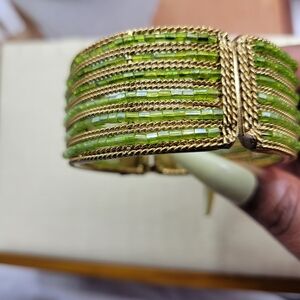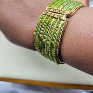 Vintage Beaded Cuff Bracelet / Citron & Gold / Hinged