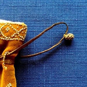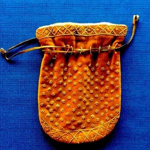 AS IS. Brown velvet drawstring bag with silk striped lining. Some beads missing around drawstring but not very noticeable. Some staining on interior. Please check photos carefully—thanks!