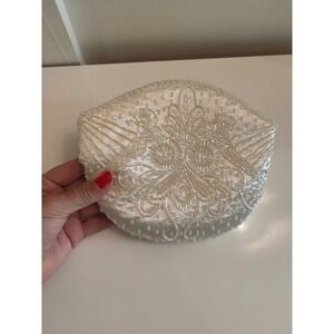Beaded vintage white clutch purse, perfect for a wedding. This handbag features an intricate beaded design on a smooth, satiny fabric, creating a luxurious and eye-catching look. Its compact size is perfect for carrying essentials. The interior is lined with a silky fabric, adding to the overall elegance of the purse. Ideal for weddings, bridal events, evening parties, or any occasion.