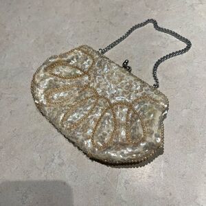 Keywords: Vintage clutch, La Regale, beaded evening bag, wedding purse, formal event bag, pearlescent sequins, made in Japan, bridal accessory.