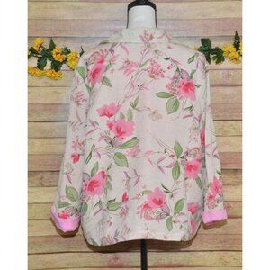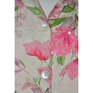 This stunning vintage jacket and matching handbag set features intricate sequin and beading with a beautiful floral design. Made from cotton and flax, the cream and pink colors, plus size 1X fit, and MOP shell button front make it a timeless addition to any wardrobe.