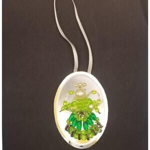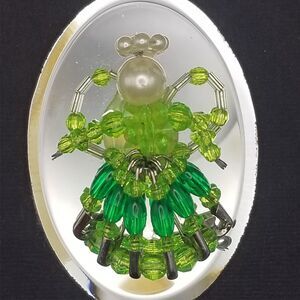 Vintage Beaded Angel Green Ornament on Mirror 3 inch Made With Safety Pins Pearls