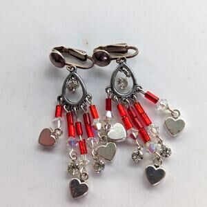 Vintage Beaded Heart ChaCha Dangle Valentines Love Rhinestone Clip On Earrings