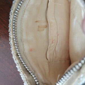 Stains on interior lining, some loose threads visible. Approx. measurements: 6.5 inches wide x 4 inches tall.