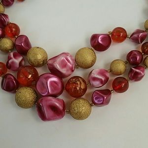 It's not labeled, but it's definitely vintage. Three strands of gold, orange and pink, with gold accents. Great piece.