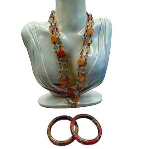 Vintage Beaded Necklace & Floral Enamel Bangle Set Crystal Pink Peach Cream N60