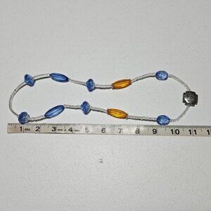 This necklace features a captivating blend of blue and orange glass beads, accentuated by a striking silver-tone pendant.