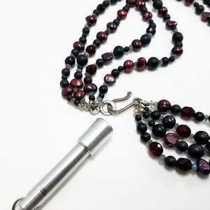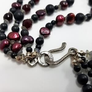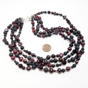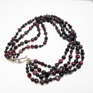 This is a striking vintage four-strand beaded necklace from the 1980s, finished with a substantial sterling silver 925 hook clasp. The necklace features an elegant mix of beads in deep burgundy, black, and subtle gray tones.