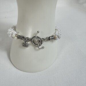 Vintage Beaded Pearl & Crystal Rope Bracelet w/ Butterfly Charm Toggle Clasp 7.5