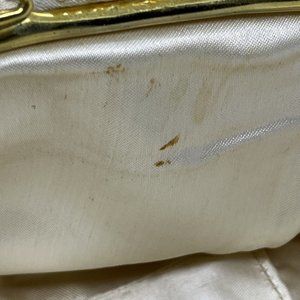 The exterior of the purse is in very good condition. There us one loose bead that I see (see pictures). The interior satin has some staining.