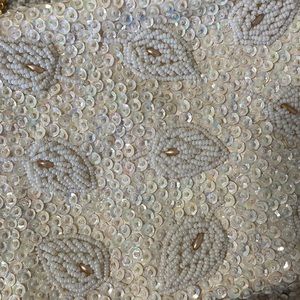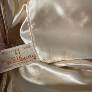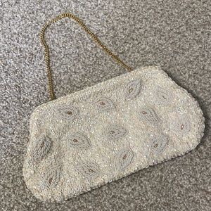 This vintage beaded mini handbag from Richere by Walborg is in good condition with only a minor flaw— a broken clasp but the bag is still functional and could be repaired. It is cream sequins with a beaded leaf pattern and gold-tone chain that can be tucked inside to carry as a clutch. The inner lining is intact and clean with a small interior pocket.