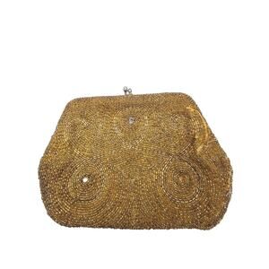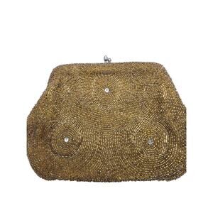 This vintage clutch purse offers a touch of elegance with its intricate gold beaded design. Its compact size is ideal for carrying essentials during formal events. Crafted in Japan, this purse reflects exquisite craftsmanship and timeless style, making it a valuable addition to any accessory collection.