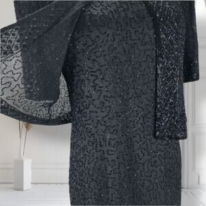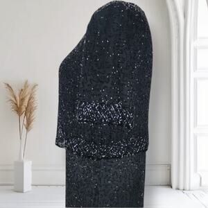 Vintage Beaded Silk Evening Gown Set Black Dress Jacket Size L Formal Gala
