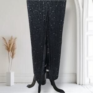 Black beaded silk, long sheath silhouette with attached short sleeve jacket and back slit, Fully lined, shoulder pads, back zip closure. Vintage 90's. Does not stretch.