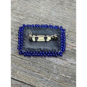 *Vintage seed bead brooch done in cobalt blue and iridescent clear seed beads in a two arrow pattern. Leather back with locking clasp.