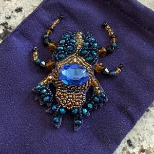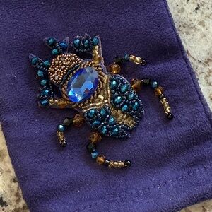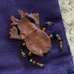 Gorgeous hand beaded and coiled insect brooch with leather backing.