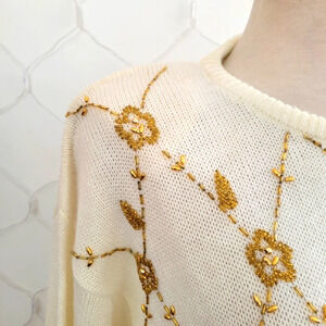Vintage Beaded Sweater • Cream & Gold • Crew • Large • Stunning