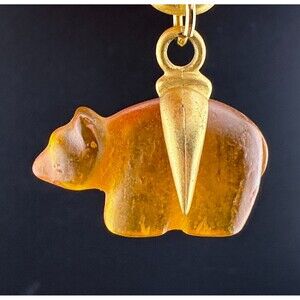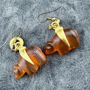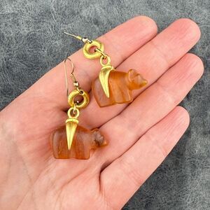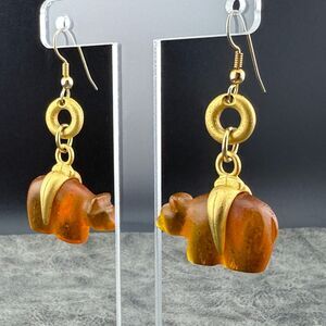 Vintage Bear Gold Tone Dangle Pierced Ear Earrings Pressed Molded Amber (?)
