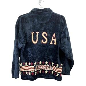 Features: Zip-front, USA emblem, Stars and stripes design, Made in USA, Full zip fleece, Pockets