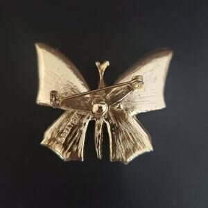 Mid Century Butterfly brooch made by Beatrix has white enamel over gold tone base. There's a minor chip along the base of the enamel, but otherwise very good condition. 1 1/2 inch wide and 1 1/4 inch tall.